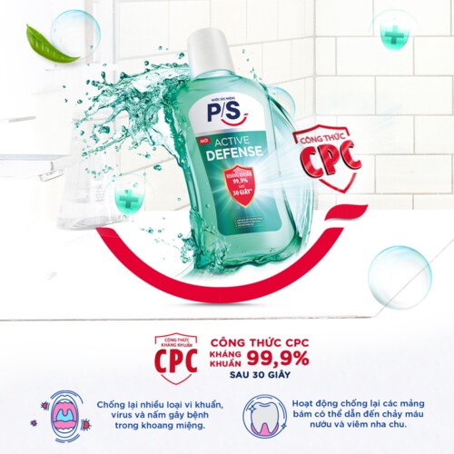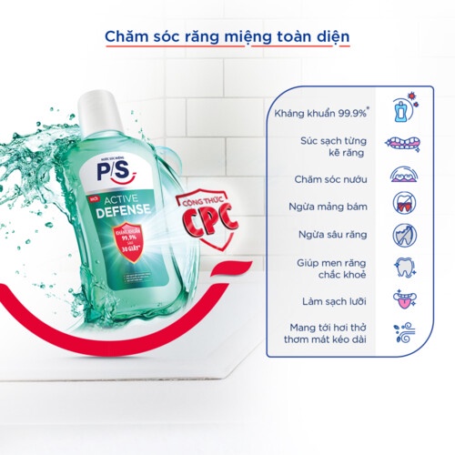 Nước súc miệng P/S Active Defense giúp làm sạch răng miệng toàn diện, súc sạch từng kẽ răng, mảng bám mà đánh răng thông thường chưa làm sạch hoàn toàn.