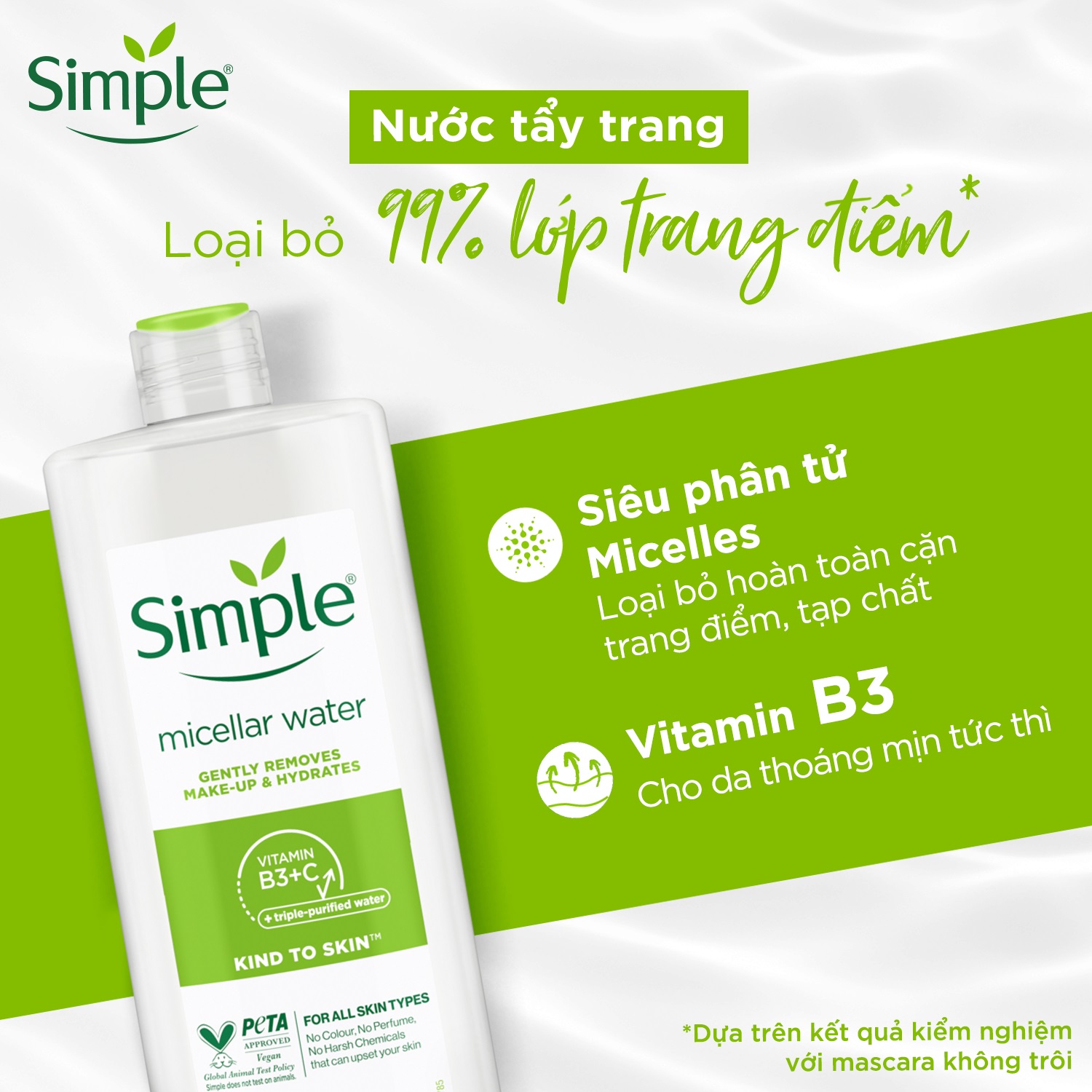 - Nước tẩy trang Simple loại bỏ đến 99% lớp trang điểm* nhờ các hạt micelle siêu nhỏ gồm một cực ưa dầu hút mọi bụi bẩn, cặn trang điểm và một cực ưa nước giúp hòa tan, cuốn trôi mọi tạp chất