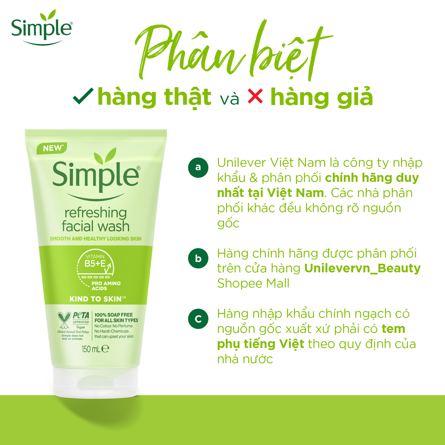 Sữa rửa mặt Simple Refreshing lành tính sạch thoáng - cho da nhạy cảm chứa X2 Vitamin B5*, Vitamin E và Pro Amino Acids giúp làm sạch da hiệu quả, cuốn đi chất nhờn, bụi bẩn và các tạp chất khác và không gây kích ứng, cho da mềm mịn, đồng thời mang lại cảm giác tươi mát và sạch thoáng cho da.