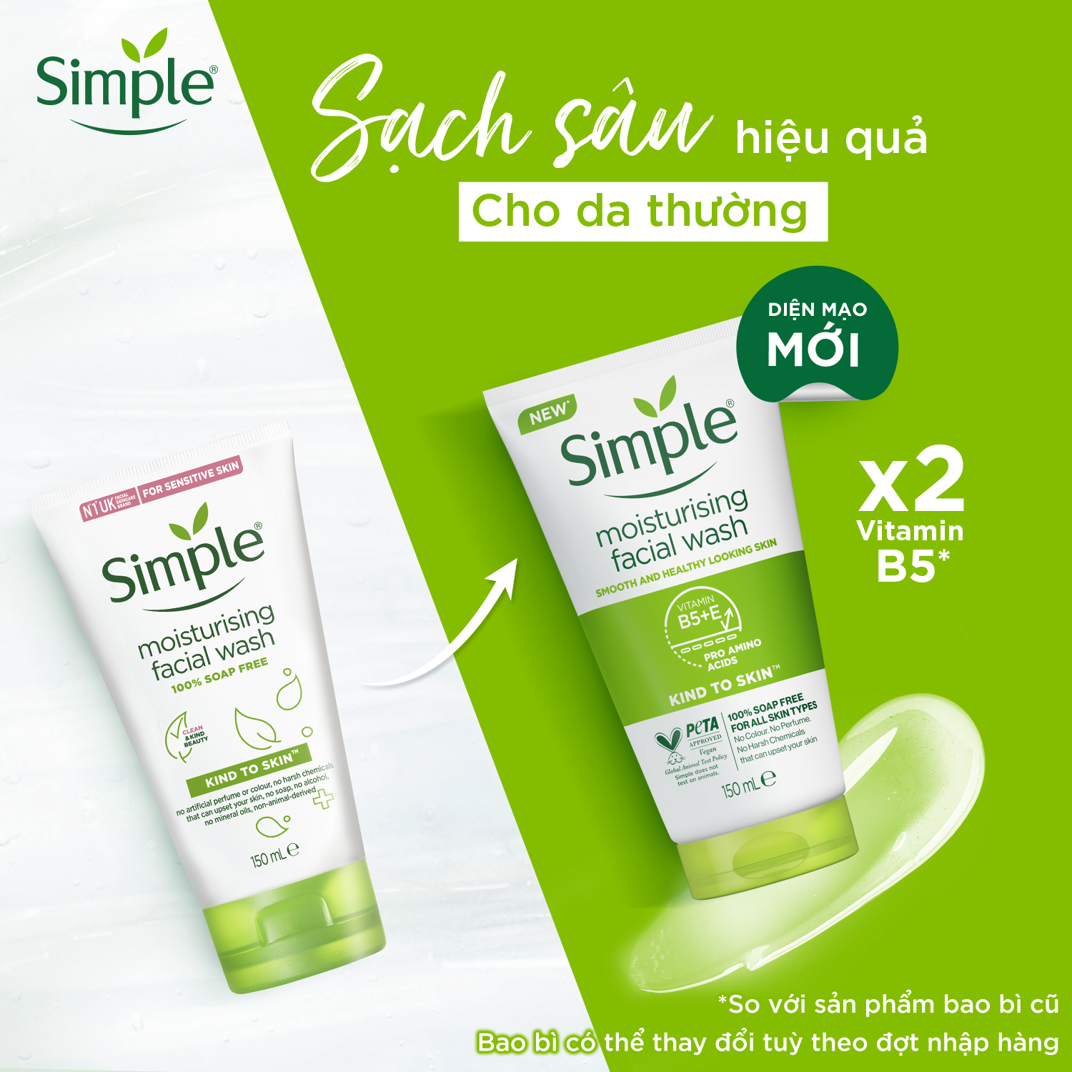 Sữa rửa mặt Simple Moisturising sạch sâu - cho da thường giúp làm sạch da hiệu quả, cuốn đi chất nhờn, bụi bẩn và các tạp chất khác. Sản phẩm chứa X2 Vitamin B5*, Vitamin E, Pro Amino Acids và Bisabolol (Hoa cúc La Mã) giúp làm dịu da, giúp da trông ẩm mượt, không bị khô căng và không gây kích ứng cho da.