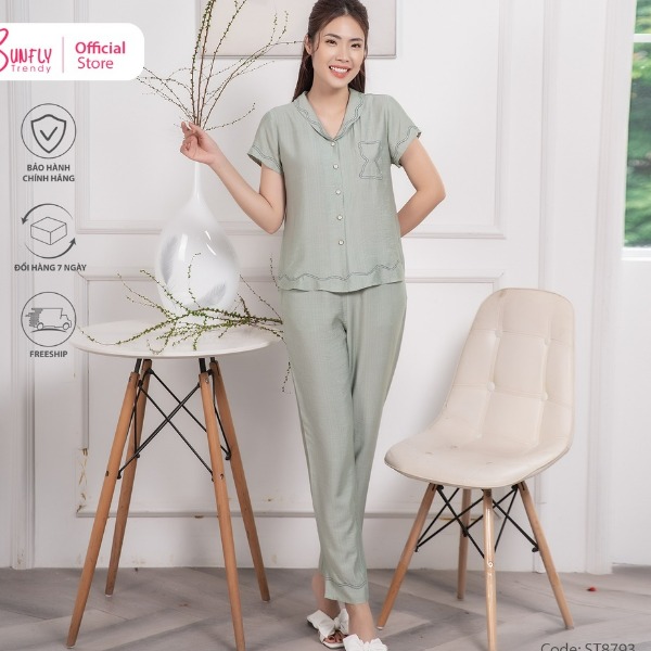 Bộ đồ mặc nhà nữ pijamas linen SUNFLY áo cộc, quần dài có tính năng thoải mái, mát mẻ khi mặc ở trong nhà. Ngoài ra, sản phẩm còn rất đa năng khi đi chợ, mua sắm hoặc làm việc trong nhà. Đặc biệt, sản phẩm với chất liệu mềm mại dễ chịu khi mặc đi ngủ.