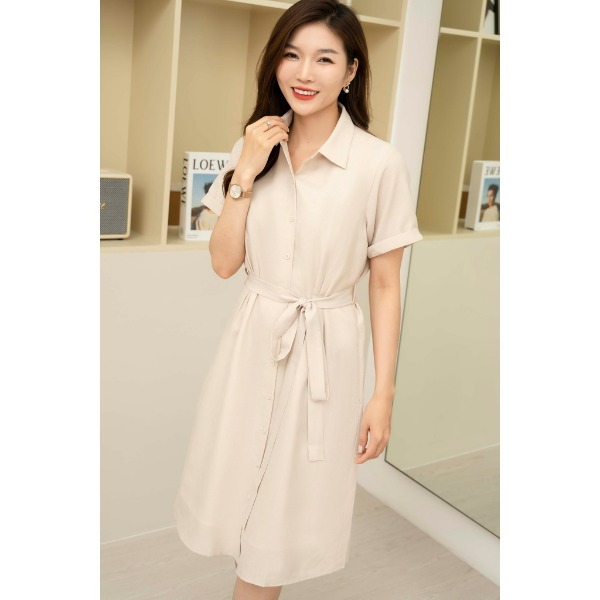 Đầm sơ mi dáng suôn, 2 lớp. Tay ngắn, lật lai. Eo có xếp các ly nhỏ nhấn nhẹ eo. Đầm có 2 túi dọc ẩn 2 bên, kèm dây thắt eo